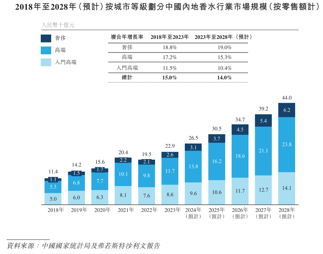 聚焦中国市场,奢侈香氛与高端香氛两大细分市场的增速,均高于入门级高端香氛。