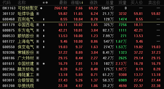 核聚变指数大幅上涨4.24%,位于万得热门指数涨幅榜前列。成份股中,百利电气、东方电气、上海电气等多股涨停;常辅股份、锡装股份、海鸥股份、中国核建等股跟涨,幅度均在7%以上。