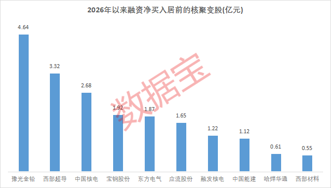 证券时报·数据宝梳理了2026年以来,融资净买入居前的核聚变概念股,其中8股净买入超1亿元。豫光金铅、西部超导、中国核电排名前三,融资净买入额依次为4.64亿元、3.32亿元、2.68亿元。