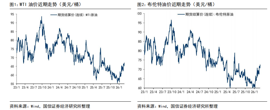 受美伊、俄乌、委内瑞拉地缘冲突博弈影响,断供风险增加,2月油价大幅上涨。2026年2月布伦特原油期货均价为69.4美元/桶,环比上涨4.7美元/桶,月末收于72.5美元/桶;WTI原油期货均价64.4美元/桶,环比上涨4.2美元/桶,月末收于67.3美元/桶。2月上旬,美伊重启核谈判,叠加哈萨克斯坦油田及美国原油产量逐步恢复,但随后原定谈判取消,地缘风险溢价快速回归,市场在谈判消息与冲突预期之间反复博弈,国际油价区间震荡;2月中下旬,IEA下调全球石油需求预测,引发供应过剩担忧,油价大幅下探后低位整理;此后美国向伊朗附近海域增兵、伊朗举行军演,叠加美国原油库存显著下降,油价再度大幅上行;2月底,美国、以色列袭击伊朗,伊朗最高领袖哈梅内伊被袭击身亡,伊朗暂时封锁霍尔木兹海峡,油价宽幅上涨。