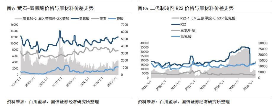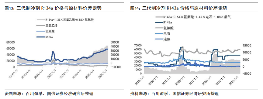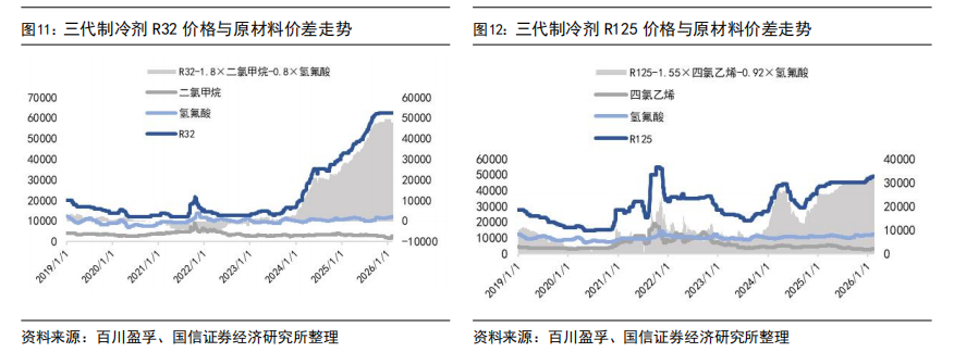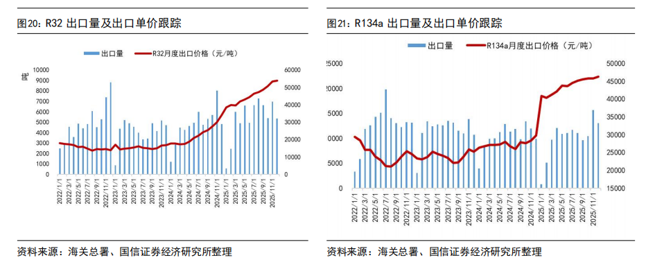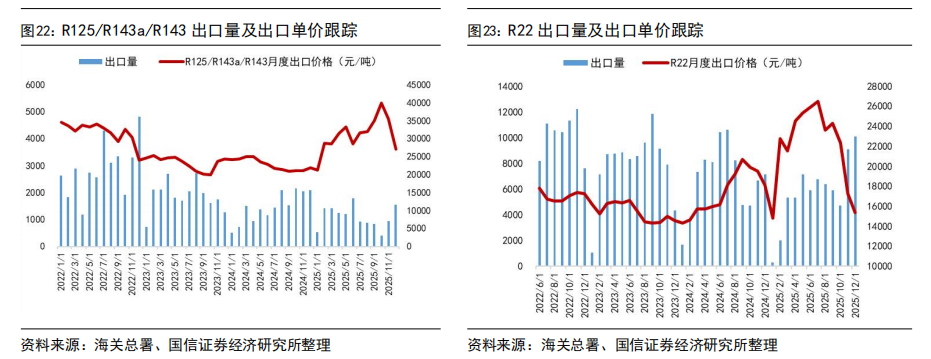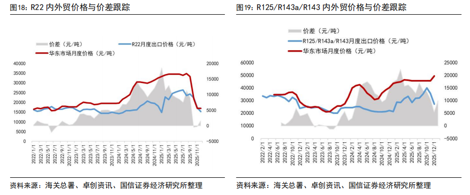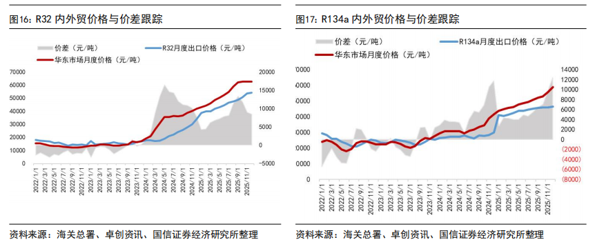 出口价格方面,截至2025年12月出口均价,R125、R32、R134a等产品外贸价格受海关出关、船运周期等因素影响,与内贸月度价格存在一定时滞,但国内外价格已实现趋同。具体来看,2025年12月R32出口均价为54047元/吨,R22出口均价为15358元/吨,R134a出口均价为46343元/吨,R125/R143系列出口均价为22412元/吨。