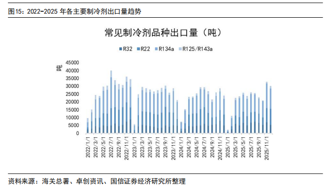 2025年,R22出口6.9万吨,同比下降15%;R32出口6.38万吨,同比增长12%;R134a出口12.11万吨,同比下降3%;R125总出口6.23万吨,同比下降23%。从出口数据来看,制冷剂海外需求持续增长以R32为主,R22受配额削减影响,同比下滑为正常趋势。从12月数据来看:R22同比增长43%,R32同比增长11%,R134a同比增长32%,R125同比下滑7%。