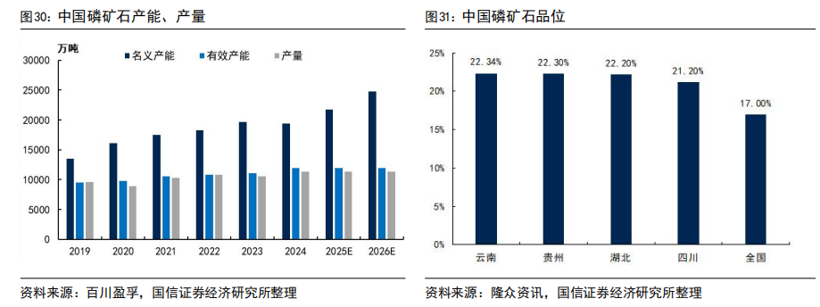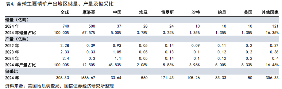 中国以全球5%储量支撑近半产量,资源保障压力突出,稀缺属性持续强化。中国磷矿石以全球约5%的储量贡献了全球45.8%的产量,储采比仅为33.6,远低于摩洛哥的1667,资源透支严重。据美国地质调查局数据,2024年全球磷矿储量740亿吨,其中摩洛哥占67.6%(500亿吨),但其因基础化工产业薄弱,产量仅占全球12.5%;而中国储量仅37亿吨,却年产超1.1亿吨,且整体品位仅17%,可采储量平均品位亦不足23%,显著低于全球30%的平均水平。在新能源需求大增与国内供给增长受限的双重作用下,磷矿石稀缺性不断强化,预计价格中枢将长期维持高位。