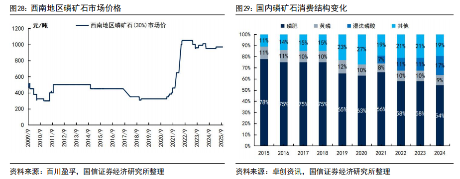 磷矿石消费结构持续演变,新能源驱动需求增量。近年来,我国磷矿石消费结构发生显著变化,传统农业需求仍为刚性支撑,但占比逐年下降。2015年磷肥占磷矿石消费总量的78%,至2024年已降至54%,反映出“减肥增效”政策与化肥使用效率提升对农业用矿的抑制;与此同时,以湿法磷酸为代表的新能源材料应用快速崛起,其消费占比从2021年的7%跃升至2024年的17%,成为磷矿石边际需求增长的核心驱动力。该部分主要用于生产磷酸铁、磷酸铁锂等新能源材料,受益于新能源汽车和储能市场的爆发式发展,带动对高品位、可净化磷矿的需求激增。黄磷消费占比稳定在8%-11%之间,其他用途(如氟化工、水处理)也逐步拓展。