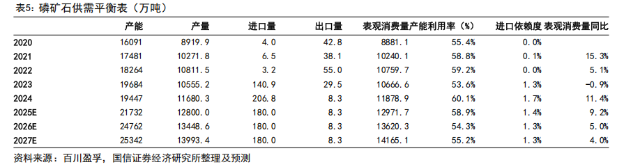 新增产能落地率或较为有限,进口难改紧平衡格局。尽管2025-2027年规划新增名义产能合计达0.59亿吨,但结合历史经验及当前政策环境、矿山开采难度及品位限制等情况,预计实际有效新增产能落地比例可能不足40%,即三年仅约0.24亿吨以内能形成真实供应。与此同时,进口虽在2024年增至207万吨(同比 46.8%),但占消费比重仍低于2%,且受内陆主产区运输成本制约,进口矿难以形成有效补充。综合来看,2025-2027年磷矿石表观消费量或将稳步升至1.42亿吨,而有效供给增速有限,供需紧平衡格局和价格高位运行态势有望持续。