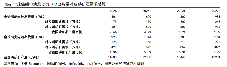 在全球储能产业加速扩张的背景下,磷酸铁锂对上游磷资源的需求持续提升。我们假设全球储能电池和动力电池中采用磷酸铁锂技术路线的比例分别为100%和50%。按行业经验值,每GWh磷酸铁锂电池约消耗0.25万吨磷酸铁(FePO4),使用4吨磷矿石/吨磷酸铁的单耗,推算对应的磷矿资源需求。参考InfoLink对储能电池出货量的预测(2025/2026年约600/800 GWh),SNE Research公布2025年前三季度全球动力电池总装车量约同比增长34.7%,以及弗若斯特沙利文对全球动力/储能电池行业2025-2029年的预测复合增速分别为26.7%/22.9%,假设全球储能电池出货量在2025-2027年分别增至600/800/983 GWh,对应磷矿石需求将升至600/800/983万吨,占我国磷矿石预测产量比重分别达到4.7%/5.9%/7.0%;同期全球动力电池出货量将增至1344/1703/2158 GWh,对应磷矿石需求升至672/852/1079万吨,占我国磷矿石预测产量比重分别达到5.3%/6.3%/7.7%。储能级磷酸铁对原料纯度要求高(低铁、低镁、低重金属),实际可适配的高品位磷矿资源远比总量稀缺,叠加动力电池的持续贡献,磷资源在新能源电池领域的消费比重将持续提升。因此,具备优质矿源及“矿化一体”能力的企业将在新能源材料竞争中占据显著战略优势。