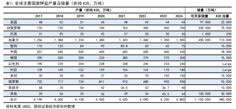 钾肥资源属性强,全球资源呈现寡头垄断格局。据USGS统计,全球探明钾盐(折K2O)资源量大约2500亿吨,探明储量(折K2O)大约33亿吨。其中加拿大、白俄罗斯和俄罗斯为全球储量最高的3个国家,合计约占全球钾盐资源总储量68.2%,其中加拿大、白俄罗斯和俄罗斯占比分别达到33.3%、22.7%、12.1%,中国仅占比5.2%。海外前八大钾肥生产企业加拿大Nutrient(加钾、加阳2017年合并)、美国美盛、乌拉尔钾肥、白俄罗斯钾肥、德国K S、以色列ICL、欧洲化学Eurochem、约旦APC的产量占比高达86%。