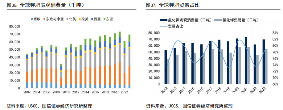 钾肥主产地与需求地差异较大,钾肥资源严重错配,进出口贸易占比超过70%。钾肥产地主要位于东欧地区(俄罗斯、白俄罗斯)、北美地区(加拿大)、西亚地区(约旦、以色列),需求地主要位于东南亚地区(中国、印度、印度尼西亚)、拉丁美洲(巴西)、北美洲(美国),因此全球钾肥贸易量占比极高。2023年全球氯化钾表观消费量约6928.6万吨,进出口量约为5447.5万吨,贸易量占比达到78.4%。根据Nutrien预测,2024年全球钾肥表观消费量约为6900-7200万吨,2025年全球钾肥表观消费量约为7000-7400万吨,2030年全球钾肥表观消费量约为8000-8500万吨。