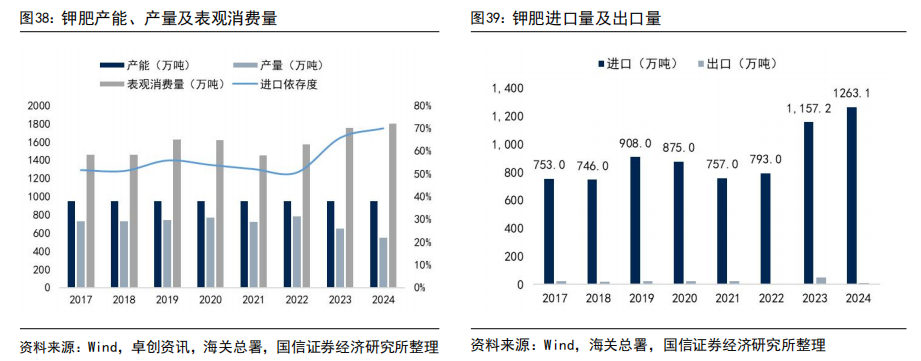 我国钾盐资源严重不足,钾盐资源以含钾卤水为主,95%集中在青海柴达木盆地与新疆罗布泊。国内钾肥资源供给不足,进口依存度超过60%。根据卓创资讯数据,2024年我国氯化钾产量550万吨,同比降低2.7%,2024年我国氯化钾进口量创历史新高,累计进口量为1263.3万吨,同比增长9.1%。我国是全球最大的钾肥需求国,对外依存度超过60%,2024年我国氯化钾表观消费量为1801.2万吨,同比增长7.7%。