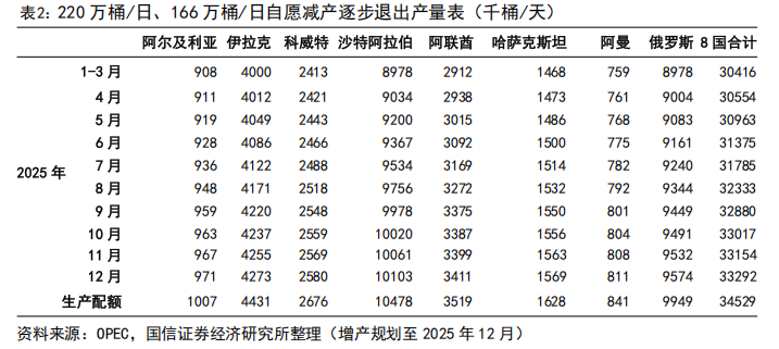 2023年11月达成的220万桶/日自愿减产已经完全退出:但4月3日OPEC 意外宣布实施超预期的石油增产计划,5月增产幅度扩充至约原计划3倍的41.1万桶/日;5月3日宣布6月延续41.1万桶/日的增产措施,5月28日宣布7月延续增产41.1万桶/日,7月5日宣布8月加速增产54.8万桶/日,8月3日宣布9月延续增产54.8万桶/日。因此截止2025年9月,2023年11月达成的220万桶/日自愿减产已经完全退出。