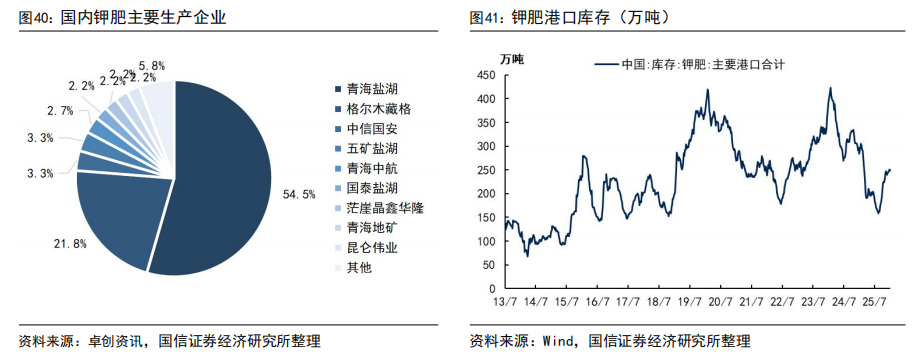 从生产企业来看,国内最主要钾肥生产企业为盐湖股份、藏格控股,合计占国内87.3%的钾肥产能。国内钾肥资源不足,每年产量基本稳定,但正是由于中国能够通过自产、以及通过国内企业进口钾肥满足约50%的需求,因此成为全球钾肥价格洼地。截至2026年1月底,国内氯化钾港口库存为249.47万吨,较去年同期减少34.51万吨,降幅为12.15%。未来由于粮食生产安全愈发被重视,预计国内钾肥安全库存量将提升到400万吨以上。