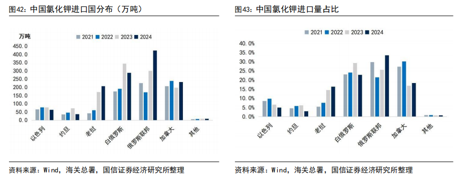 我国钾肥进口主要来自加拿大、俄罗斯、白俄罗斯,近年来老挝进口量快速增长。我国钾肥超过70%进口量来自加拿大、俄罗斯、白俄罗斯三国,2024年全年进口1263.3万吨,其中来自加拿大、俄罗斯、白俄罗斯的进口量分别为232.9、424.4、288.8万吨,分别占比18.4%、33.6%、22.9%,合计占比74.9%。此外,来自以色列、约旦、老挝的进口量分别为63.2、37.4、207.2万吨,其中来自老挝的进口量同比增长21.3%。