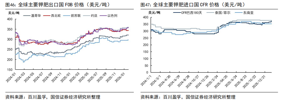 展望2026年全年,供应面,全球钾肥产能扩张主要集中在2027年后,2026年新增产能有限。2025年12月亚钾国际第三个百万吨钾肥项目联动投料试车圆满成功,预计2026年稳定生产,或缓解国内钾肥供应紧张局面;其他地区如加拿大、俄罗斯等主要钾肥生产国的新增产能有限,2026年国内预计仍将保持较高进口依赖度。自2025年12月1日起,俄罗斯铁路货运运价将上调10%,进口成本或将会有所上涨;2025年12月13日美国宣布解除对白俄罗斯钾肥公司及其相关实体的制裁;同时俄罗斯、白俄罗斯等钾肥生产国的地缘政治冲突可能影响钾肥供应,这些变化可能对全球钾肥供应链及市场格局产生进一步影响,导致价格波动。