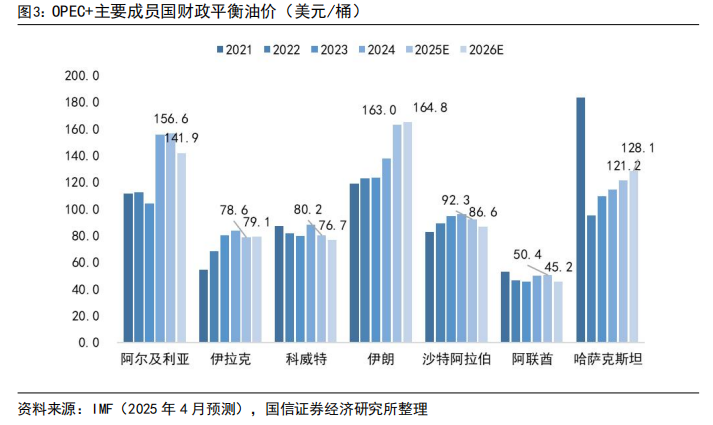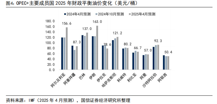 沙特阿拉伯、伊朗、伊拉克、科威特、哈萨克斯坦、阿尔及利亚的石油液体合计产量占全球的25%左右,2025年4月IMF预测其2025年财政平衡油价分别为92.3、163.0、78.6、80.2、121.2、156.6美元/桶,较2024年10月IMF预测数据分别 1.4、 38.9、-13.8、-1.6、 5.3、 37.6美元/桶。