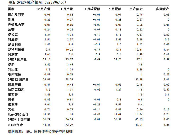 根据IEA最新发布的月度报告统计,2026年1月OPEC 产量为4329万桶/天,已经减产435万桶/天,沙特、俄罗斯产量分别为1028、930万桶/天。