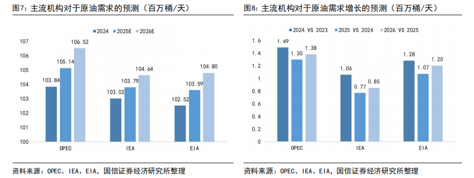 需求端:国际主要能源机构预计2026年原油需求增长85-138万桶/天,预计2027年原油需求增长128-134万桶/天:根据OPEC、IEA、EIA最新2月月报显示,2026年原油需求分别为106.52、104.64、104.80百万桶/天,分别较2025年增加138、85、120万桶/天,IEA下调2026年需求增量8万桶/日,EIA上调2026年需求增量6万桶/日;2027年OPEC、EIA预测原油需求分别为107.86、106.08,分别较2026年增加134、128万桶/天,需求增速较2026年有所增长。