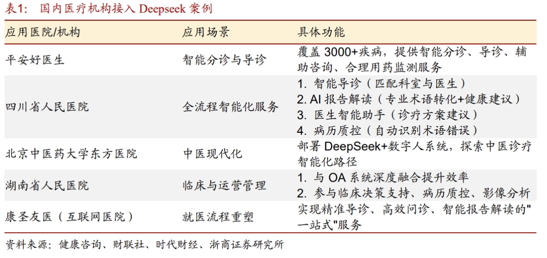 近年来,全球大模型技术进入加速进化阶段,大模型的推理能力和多模态能力持续升级。与此同时,大模型应用成本不断降低,开源运动兴起,大模型在各领域的应用条件愈发成熟。在医疗领域,大模型技术正在加速落地,单模数据处理正在向多模态数据处理转变,DeepSeek以低成本和开源的优势,成为国内医疗机构部署的首选。1.1 技术驱动AI医疗发展,当前进入多模态融合阶段AI技术在医疗领域的应用历经了从规则驱动到数据驱动、从单一任务优化到多模态协同的演变,大致可分为以下四个关键阶段:1)规则驱动与专家系统时代:该阶段主要是基于人工提炼的医学规则构建诊断系统,代表性的产品是早期的专家系统(如MYCIN、INTERNIST-1),通过逻辑推理模拟医生的临床决策。2)传统机器学习与影像识别阶段:该阶段主要利用统计学与浅层模型处理结构化医疗数据。代表性技术是SVM、随机森林等算法应用于医学影像分类。3)深度学习与单模态模型阶段:通过深度神经网络自主提取特征,实现单模态数据的端到端学习。代表性技术是卷积神经网络(CNN)、循环神经网络(RNN),AI技术主要应用于影像诊断和病理辅助。4)大模型与多模态融合时代:借助Transformer架构统一处理跨模态数据,构建“感知-推理-协作”全链条能力,主要应用场景是临床决策支持、药物研发和远程医疗。在临床医疗中,往往需要综合多源、多模态的数据,进行诊断、预后评估和制定治疗方案。大模型的多模态数据处理能力,开启了AI医疗的新篇章。2023年《Nature Medicine》的综述《Multimodal machine learning in healthcare: a review》定义多模态AI为下一代医疗技术方向。早期医疗AI多局限于单一任务优化,主要存在信息割裂、解释性弱和数据孤岛等问题:1)信息割裂:如仅凭影像无法判断肿瘤病理分型;2)传统CNN模型无法像医生一样用自然语言解释诊断依据;3)数据孤岛:不同医院使用的影像格式、病历系统互不兼容。大模型通过“预训练 微调”架构,用统一参数体系处理多模态医疗数据:使用Transformer架构对不同模态数据(文本、图像、基因序列)进行向量化编码,在隐空间实现信息对齐。对比学习(如CLIP技术)降低跨模态对齐成本,避免传统方法需人工标注海量匹配样本的负担。在临床应用中,借助多模态技术,AI可以实现跨模态数据的理解和动态时序建模。1.2 Deepseek具有低成本和开源特征,加速在医疗行业渗透DeepSeek作为国产开源大模型的代表,具备高性能、低成本和开源的特征,契合医疗机构对高效和安全的需求,其出现对医疗AI领域的技术渗透与商业化落地产生了催化作用。➢DeepSeek将国产大模型的能力带到了新台阶。在医疗领域,DeepSeek可以快速分析多种类型的医疗数据,帮助医生梳理复杂病例,给出治疗思路和建议。这种能力在重症监护室ICU、急诊科、儿科等场景中尤为重要,能够显著提升诊疗效率和准确性。此外,DeepSeek在药物研发、影像分析、诊断筛查等多个领域都有所应用,显示了其在医疗健康领域的广泛应用潜力。➢闭源大模型(如GPT-4)高昂的API调用成本与算力需求限制中小医疗机构使用。DeepSeek的API价格较低,使得医疗机构能够以较低的成本部署和使用AI技术,成本下降推动医疗AI从头部医院试点转向基层普惠应用。DeepSeek输入价格为每百万tokens 0.5元(缓存命中)/2元(缓存未命中),输出价格为每百万tokens 8元,这些价格远低于目前最顶尖的闭源大模型如GPT-4o和Claude-3.5-Sonnet。