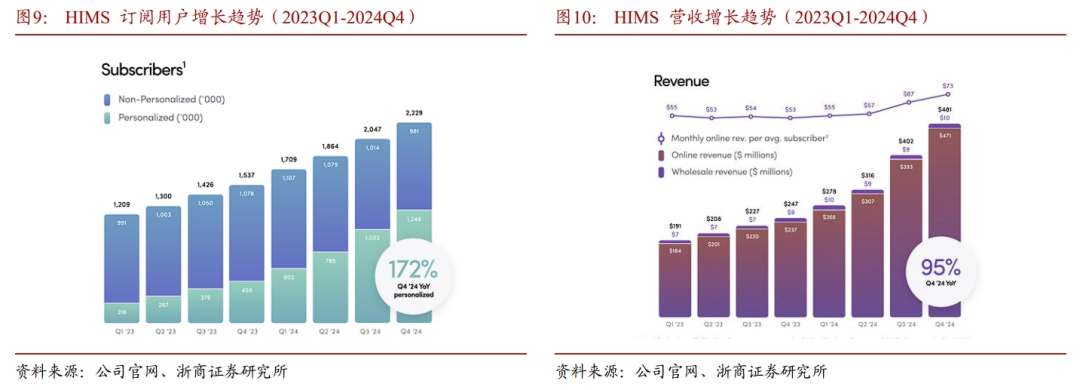DeepSeek作为国产开源大模型的代表,具备高性能、低成本和开源的特征,契合医疗机构对高效和安全的需求,其出现对医疗AI领域的技术渗透与商业化落地产生了催化作用:1)DeepSeek可以快速分析多种类型的医疗数据,帮助医生梳理复杂病例,给出治疗思路和建议。2)DeepSeek的API价格较低,成本下降推动医疗AI从头部医院试点转向基层普惠应用。3)Deepseek作为开源模型可私有部署,源代码会更加可控,更契合医院的安全需求。从海外经验来看,英伟达、微软等AI巨头积极布局医疗领域,看好AI医疗发展前景,围绕核心能力通过收购和生态赋能的方式长远布局。专注于医疗领域的AI厂商已经成功实现商业化:Tempus AI 通过数据服务业务和智能化 产品支撑营收高增长,2024Q4单季度营收 35.8%,公司预计2025年营收同比 79%;HIMS 利用AI为用户提供远程个性化解决方案, 24Q4实现4.81亿美元的营收,同比 95%,订阅用户数达到2.23万,同比 172%。在AI技术驱动下,订阅用户数高速增长。根据企业的业务基因,国内在AI领域布局的厂商主要有三种类型:1)通用大模型厂商,利用底层大模型能力搭建AI 医疗平台,为医疗机构赋能;2)拥有数据库优势的厂商,为医疗机构和药企提供数据服务,或基于数据积累训练垂类模型; 3)传统医疗IT公司转型AI,将AI技术嵌入主营业务,实现存量客户价值升级。