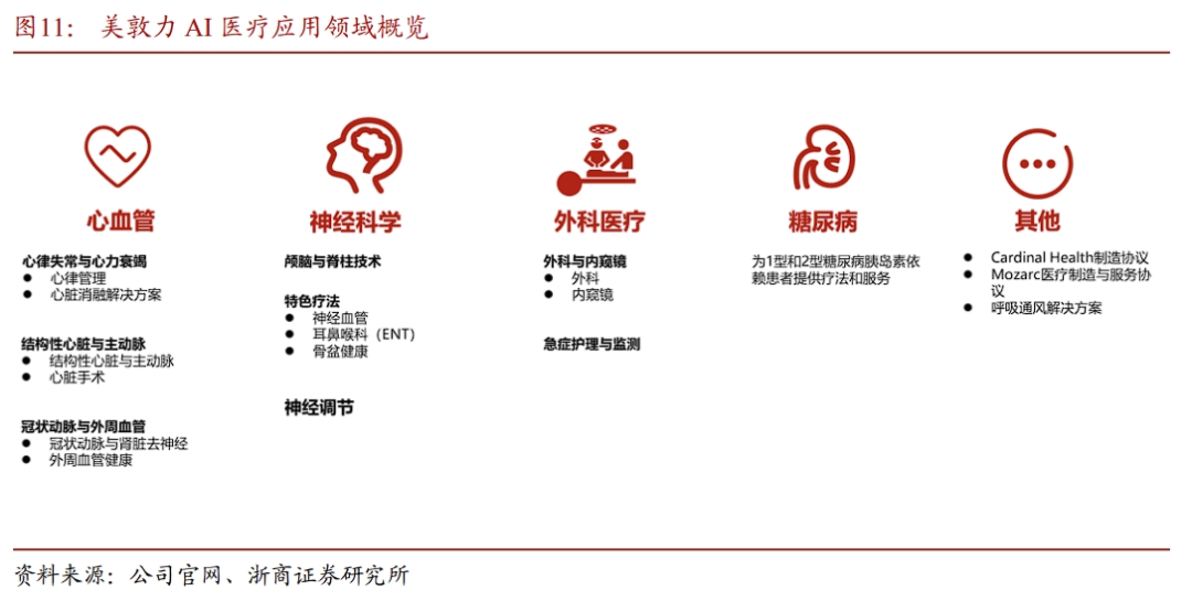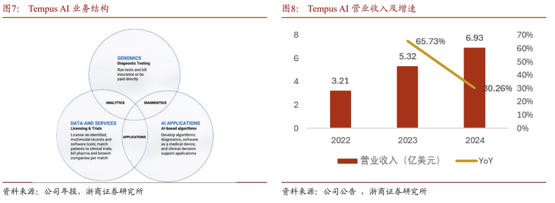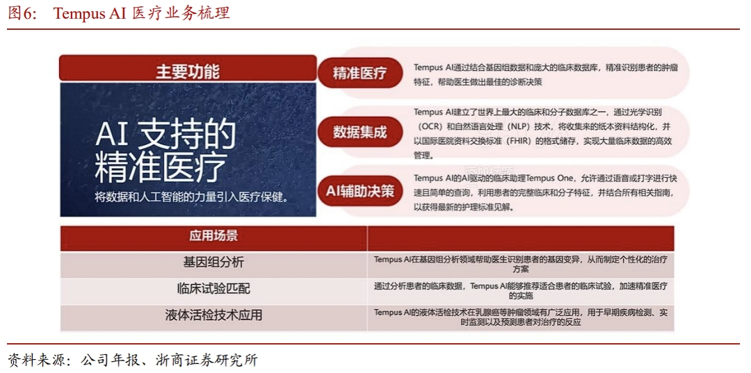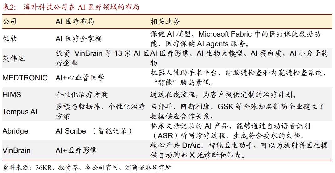 ➢改善患者体验:93%的患者报告 整体体验有所改善。2.3 Tempus AI(TEM):开创精准智能化医疗新篇章Tempus AI(TEM)是一家应用人工智能技术于癌症治疗的公司,旨在通过数据分析为患者提供个性化治疗方案,以优化治疗效果。公司拥有全球最大的多模态数据库。Tempus AI已积累了超过9亿份文档数据,包括临床数据、基因数据、病理数据和医学影像数据,涵盖超过560万份去标识化的患者记录。截至2023年底,其数据容量已达到200PB,公司已与拜耳、阿斯利康、GSK等全球知名制药企业建立了数据供应合作关系,并与梅奥诊所、西北大学等医疗机构的超过7000名医生以及多家全球顶级医院开展合作。基于庞大的数据集,以AI赋能药物研发和精准医疗。Tempus AI 的业务围绕三个主要产品线展开:基因组学(Genomics)、数据与服务(Data and Services)以及人工智能应用(AI Applications)。数据和服务业务支撑营收高增,Tempus AI Q4单季度营收为2.01亿美元,同比增长35.8%,根据公司给的指引,预计2025年将实现收入12.3亿美元,同比增长将超过79%。2.4 Abridge: 电子病历赛道龙头,将LLM应用于临床记录Abridge是医疗领域AI Scribe 赛道的龙头。核心产品AI记录助手,是一款用于临床文档记录的AI产品,能够通过自动语音识别(ASR)听写诊疗过程,并利用生成性AI生成符合要求的文档。从效果上看,Abridge能完成 91% 以上的文档记录工作量,为医生节省超过70小时/月的工作时间,而且与美国最大的电子医疗系统Epic深度整合,无需改变医生现有工作习惯。Abridge目前是AI Scribe的龙头,在 KLAS 2024 报告中,Abridge 在改善临床医生体验方面得分 95.3(平均分79.6),排名第一;在改善患者体验和改进诊疗结果方面,也分别排名第三和第四。2024年10月,根据 The Information 消息,Abridge 正在筹集 2.5 亿美元。科技投资者 Elad Gil 和 IVP 将领投这笔投资,Alphabet 的 CapitalG 基金预计也将参投。据报道,该轮融资估值将达到 25 亿美元,公司表示部分资金将用于开发新的 AI 模型,以及尚未发布的新产品。2.5 HIMS:AI Saas,远程提供个性化治疗方案Hims 是远程医疗的代表性公司,提供在线平台平台服务,目前平台拥有超过 100 万订阅者,主要为用户提供性健康、减肥、头发再生、心理健康和护肤支持。通过在线流程,用户可与持牌医生联系,寻求定制的治疗计划。Hims的核心产品之一是MedMatch,一款AI驱动的医疗保健解决方案。MedMatch 通过机器学习和人工智能技术,整合了数百万个数据点,包括历史临床数据、人口统计学、治疗类型和患者结果。这些数据点被用于训练模型,以推荐最佳的临床决策和治疗方案。目前MedMatch被用于心理健康、男性健康、女性皮肤管理等敏感领域。Hims 采用订阅模式,公司90%收入来自定期配送服务,这种模式不仅提高了用户粘性,还使用户的生命周期价值(LTV)是传统模式的3倍。HIMS在24Q4实现了4.81亿美元的营收,同比 95%,收入呈现高速增长趋势。截止到2024Q4,公司订阅用户数为2.23万,同比 172%。在AI技术驱动下,订阅用户数高速增长。2.6 Medtronic:AI融入心血管医学,助力早期诊断美敦力(Medtronic)是全球领先的医疗技术公司,专注于开发和制造各种医疗设备、产品和技术,是传统医疗信息化企业融合AI技术的代表之一,在AI 医疗领域,Medtronic 已经取得了显著的进展:在慢性病管理领域,推出智能胰岛素笔。Medtronic 推出了唯一获得 FDA 批准的“智能”胰岛素笔,该笔集成了葡萄糖传感器数据,为依赖每日多次注射的1型糖尿病患者提供 AI 驱动的个性化治疗建议。在临床医疗领域,Medtronic利用机器人进行辅助手术。Medtronic 的 Hugo™ System 是一个先进的机器人辅助手术平台,通过 AI 技术提高手术的精确性和安全性。在疾病预测与诊断领域,Medtronic利用复杂的算法分析大量的匿名健康数据,以识别趋势和共性。例如,AI 算法可以帮助医生更准确地检测异常心律,如房颤,从而提前发现可能导致中风或心力衰竭的疾病。利用数字孪生技术提供个性化治疗。Medtronic 的工程师正在构建一些设备的虚拟表示,或“数字孪生”,以预测这些设备在不同情况下在人体内的反应。这种技术可以帮助医生为每个患者提供个性化的治疗方案。根据企业的业务基因,国内在AI领域布局的厂商主要有三种类型:1)通用大模型厂商,比如科大讯飞,利用底层大模型能力搭建AI 医疗平台,为医疗机构赋能;2)拥有数据库优势的厂商,为医疗机构和药企提供数据服务,或基于数据积累训练垂类模型,主要代表有润达医疗、医渡科技、朗玛信息等;3)传统医疗信息化企业,垂类模型拥有数据优势 :润达医疗、医渡科技;3)传统医疗IT公司转型AI,将AI技术嵌入主营业务,实现存量客户价值升级。2023年10月24日,科大讯飞在全球开发者节上正式发布星火医疗大模型。星火医疗大模型学习了上亿级医疗专业知识和脱敏病例,以及上亿级Token的医学文献数据,可实现医疗知识问答、专业文书生成、诊断治疗推荐等功能。对比GPT-4大模型在医疗领域的表现,讯飞星火的医疗大模型在医疗海量知识问答、医疗复杂语言理解、医疗专业文书生成等六大核心能力方面超越GPT-4。讯飞医疗已经在全国400多个县区取得规模化的成功应用,未来在AI大模型赋能下有望实现深度赋能。截止2024年1月19日,智医助理累计覆盖全国30多个省份400多个区县并常态化应用,已提供人工智能辅助诊断建议超过 7.4 亿条、电子病历标准化建议超过 2.8 亿条,并纠正超