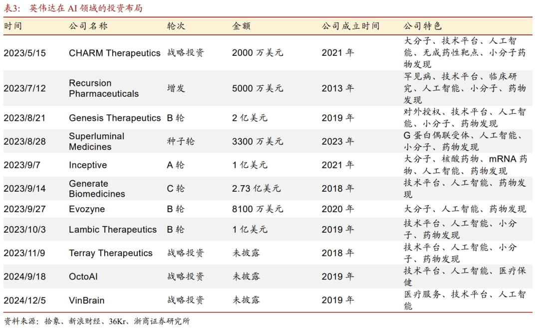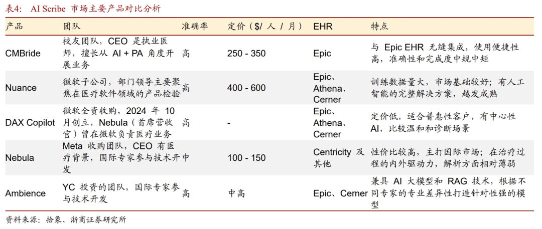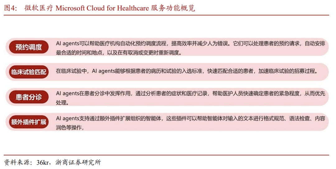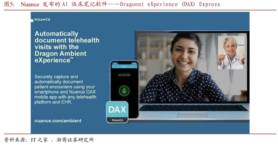 ➢DeepSeek的代码是开源的,医疗机构能自由地下载源代码并且部署到本地。医疗领域的数据和安全较为敏感,云端接入闭源模型可能存在数据安全问题,部署开源模型,源代码会更加可控,更契合医院的安全需求。国内医疗机构积极拥抱DeepSeek,目前已有多家医院宣布完成DeepSeek本地化部署。1.3 医疗是大模型重要落地场景,AI医疗市场规模复合增长率超32%根据Data Bridge的测算,预计至2031年全球生成式AI在医疗保健领域市场规模将达到172亿美元,2023-2031年期间复合增长率为32.60%。Wise Guy Reports数据显示,2023 年人工智能在医学影像市场规模预计为 92.6亿美元,人工智能在医学影像市场行业预计将从 2024 年的100.5亿美元增长到2032年的192.67亿美元,期间复合增长率为8.48%左右。根据艾瑞咨询统计,截止2023年底,中国行业大模型的个数占比已经超过8成。以医疗与金融为首要落地领域,分别占比达到21.9%与12.8%,医疗健康场景成为AI大模型的重要应用场景。1)AI巨头,比如英伟达、微软,将公司的AI基础设施和平台能力赋能到医疗业务,围绕核心能力同收购和生态赋能的方式长远布局;2)传统的医疗IT或Saas企业,将AI能力融入现有业务;3)原生AI医疗企业,以AI技术为根基,为医疗客户提供智能化产品,如为制药企业提供数据服务的Tempus AI、AI独角兽Abridge。2.1 英伟达:硬件(GPU)赋能 加速计算平台(Clara) 生态投资英伟达通过投资、技术合作与生态系统构建,持续深耕医疗AI领域,其战略核心在于硬件(GPU)赋能、加速计算平台(Clara) 生态投资的组合模式,目前已形成从药物研发到临床诊疗的全链条布局。通过直接投资拓展AI医疗版图:2023年,英伟达成立投资部门Nventures,重点布局药物研发、医学影像分析、基因组学与精准医疗等领域。截至目前至少投资了13家AI医疗企业,包括 AI生物大模型独角兽Recursion、AI蛋白质明星公司Genesis Therapeutics、AI小分子药物平台lambicTherapeutics。以Clara平台为中心,构建AI医疗生态。英伟达以 NVIDIA Clara 医疗平台为核心,提供开源工具链与加速计算架构,推动医疗AI普及:1)Clara Imaging医学影响开发框架,帮助企业和研究机构构建用于医学成像的AI解决方;2)Clara Discovery(药物研发工具包),核心组件是DGX SuperPOD:专为AlphaFold设计的算力集群,缩短蛋白质结构预测时间,以及NVIDIA BioNeMo:大语言模型框架,支持小分子生成、靶点结合能计算。2.2 微软:发布医疗行业的语音AI助手——Dragon Copilot微软在AI医疗领域的布局主要有:1)为医疗机构提供云服务平台;2)收购Nuance Communications,吸收其语音识别识别技术;3)发布智能化产品,比如Dragon Copilot和英伟达类似,微软同样基于自身的核心能力,通过平台方式赋能生态,并通过收购切入医疗领域。Microsoft Cloud for Healthcare 是微软公司针对医疗行业推出的一项云服务,整合了数据互操作性、AI工具和行业标准化接口,支持医疗机构实现数据整合、患者参与度提升及临床协作优化。2024年10月,微软宣布在其Microsoft Cloud for Healthcare中推出新的医疗数据功能和AI工具,包括通过Azure AI Studio中的新医疗保健AI模型、Microsoft Fabric中的医疗数据功能、Copilot Studio中的医疗保健AI agents服务以及AI驱动的护理工作流程解决方案,目的是为帮助医疗机构更快低构建AI应用。2022年4月,微软以197亿美元的价格完成对Nuance公司的收购,后者是全球最大的专门从事语音识别软件的公司之一。微软将Nuance的Dragon Ambient EXperience(DAX)的环境临床解决方案直接嵌入到了自身云服务中。在微软解决方案覆盖的医院中,系统将自动捕捉记录医生和病人之间的对话,并通过AI进行语境分析和自动创建临床记录,大大提升了医疗效率。2023年3月,Nuance发布名为Dragon Ambient EXperience Express(DAX Express)的AI临床笔记软件,可在病人就诊后几秒内自动生成临床笔记草稿。该款软件是由环境人工智能(Ambient A.I.)与GPT-4驱动,主要面向医护人员旨在提升医护人员的工作效率。2025年3月4日发布医疗行业首个统一的语音AI助手——Dragon Copilot。通过整合和扩展经过验证的 Dragon Medical One (DMO) 和 DAX Copilot (DAX) 的功能,为医护人员提供统一的语音 AI 体验。根据微软的调查数据,Dragon Copilot 在实际应用中已经取得了显著的效果:➢节省时间:医护人员在每次患者接触中平均节省了5分钟 时间