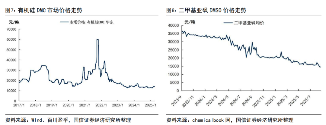 二甲基亚砜产品盈利能力表现亮眼。二甲基亚砜除了医药、农药、半导体及碳纤维行业的刚需外,肥料、皮革、钙钛矿电池等新兴市场不断出现,同时对产品质量提出了新的要求。据兴发集团半年报披露,公司攻克了二甲基亚砜绿色高效合成技术,“二甲基亚砜绿色高效合成关键技术及产业化”荣获中国石油和化学工业科技进步一等奖。目前公司二甲基亚砜产能规模已经达到6万吨/年,是全球最大的亚砜生产商,规模超过全球总产能的50%。2025年上半年,兴发集团拥有5万吨/年二甲基亚砜产能的子公司新疆兴发化工实现营业收入3.23亿元,净利润1.06亿元,净利润率32.76%,公司亚砜产品的盈利能力保持了良好水平。
