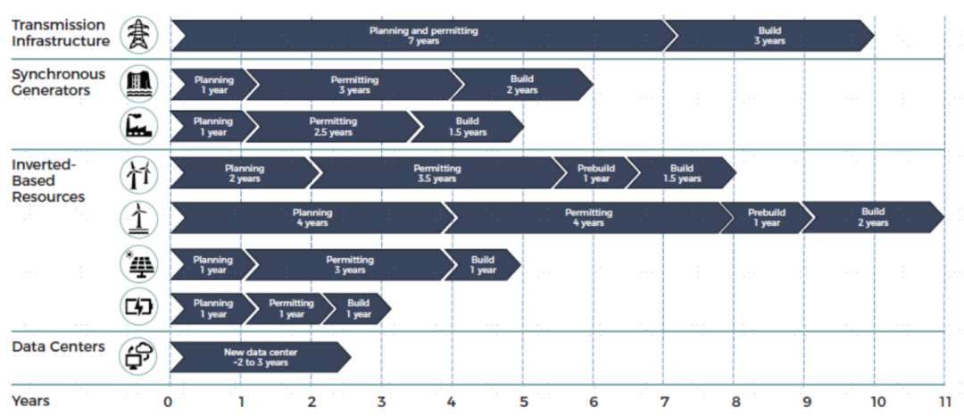 传统可调度电源快速退出,新增机组难。电源结构发生系统性变化,新增电源(主要是新能源)的可靠性属性与退出电源(化石燃料和核电机组)不对等,叠加新建机组并网延误问题(根据LBNL,2024年申请到投运时间拉长至4-5年),导致系统有效容量增长滞后于名义装机增长。