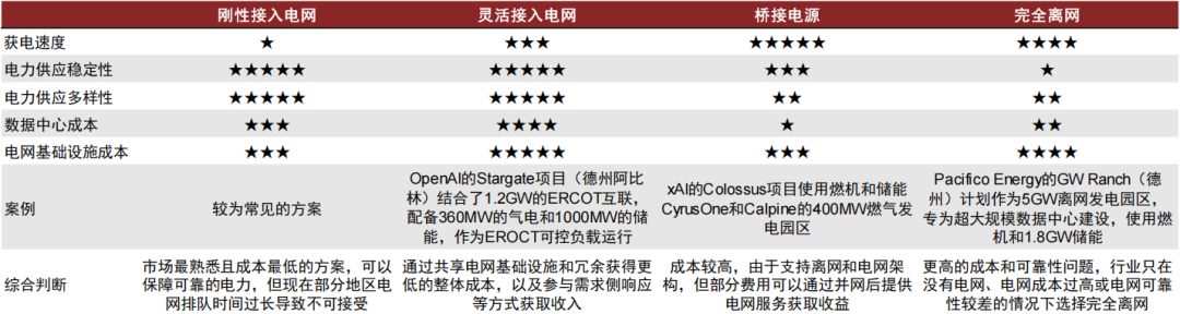 混合模式或是基于供电稳定性、设备供应能力等方面能见度较高的方向。我们认为未来自主供电将逐步发展成两类模式:1)引入自备电加快并网后,以电网 自备电结合实现供电,可以探索灵活性模式实现更大经济效益,以及2)100%离网供电系统,尽管快速通电确定性更高,但前期投资较大,且失去电网支撑,以自备电厂实现电网级别的可靠性需要更高的冗余性和设计成本,前者或是短期内可行性更高的方案。