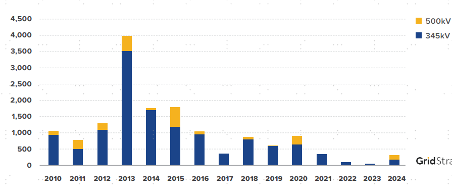 图表5:美国2010-2024年新增345千伏输电线路英里数