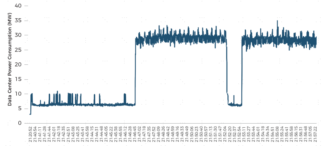 ► 训练期间的高频扰动:在执行模型训练期间会出现持续的高频尖峰,在训练与保存检查点之间转换时,功率会出现瞬时变化。如图15所示,1个50MW的数据中心(园区合计规模在200MW),在AI训练模型时功率在290毫秒内从6MW跃升至30MW,随后功率高频出现5MW以上的尖峰,持续约5分钟。