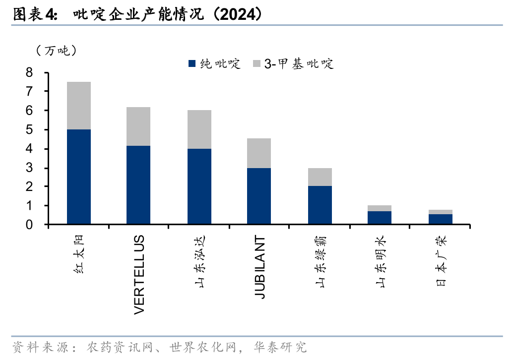据AgroPages,我国为百草枯主要生产及出口国,24年红太阳/江苏诺恩/山东绿霸百草枯折百产能分别为3.2/1.2/1.0万吨,供应较为集中,18/19年我国百草枯折百出口量为6.4/5.6万吨。海外方面,先正达英国工厂产能为9000吨,由于竞争压力以及需就上千起百草枯诉讼案与帕金森病患者达成和解等原因,先正达近日宣布将于2026年6月底前全面停止百草枯的全球生产。印度亦存有产能,但需从中国进口吡啶等原料。红太阳/山东绿霸等配套吡啶等产能,我国供应端优势未来有望增强。