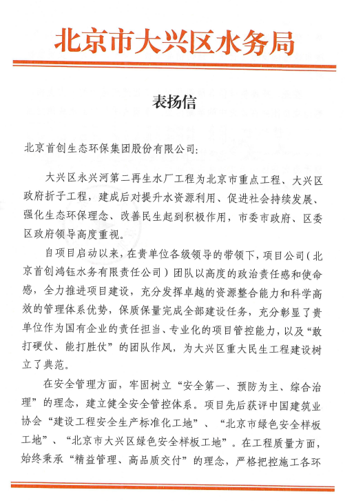 近日,首创环保集团收到了一封来自北京市大兴区水务局的表扬信,对公司在北京市重点工程——大兴区永兴河第二再生水厂工程项目建设运营过程中的突出表现予以高度肯定与表扬。