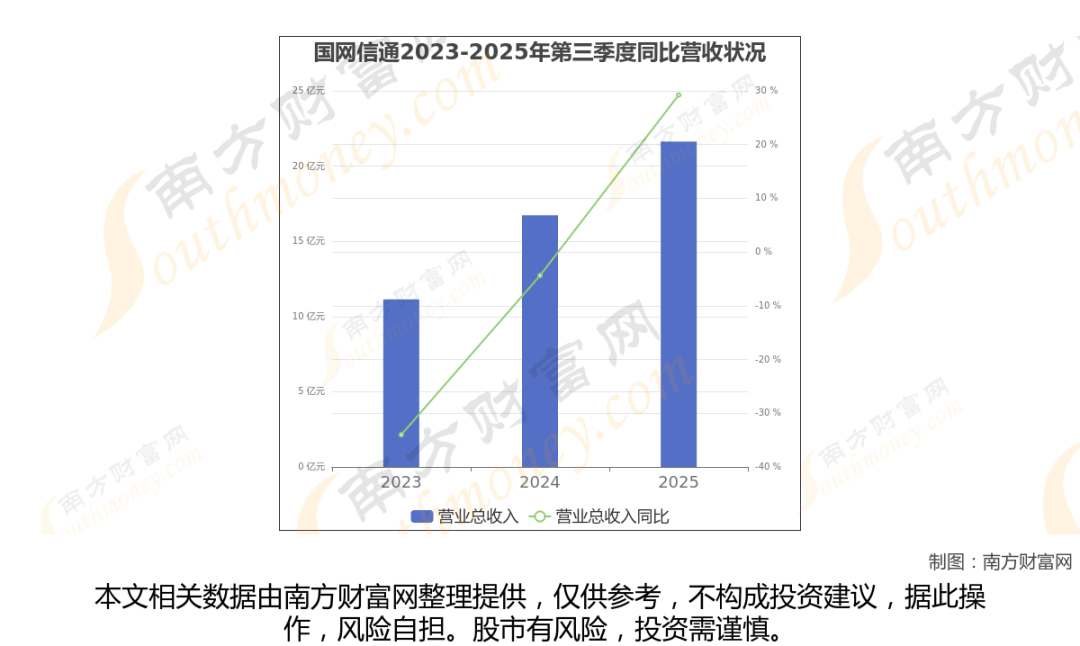 在2025年第三季度,国网信通的业绩表现(如上图),主营业务收入达到21.63亿元,实现了29.24%的同比增长率。