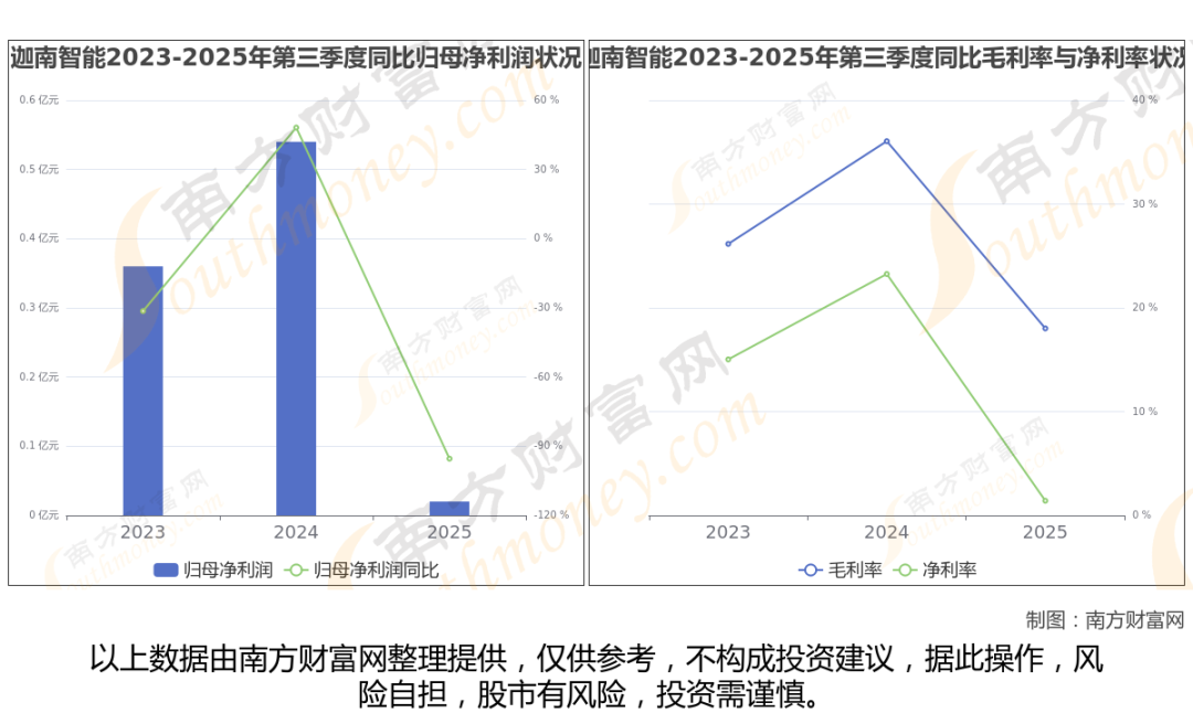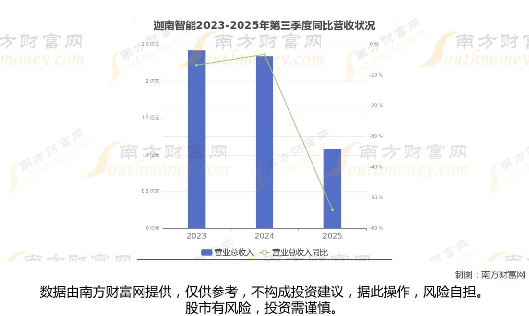 于2025年第三季度,迦南智能披露了其业绩表现(如上图),其中主营业务收入1.08亿元,相较于去年同期-54%。