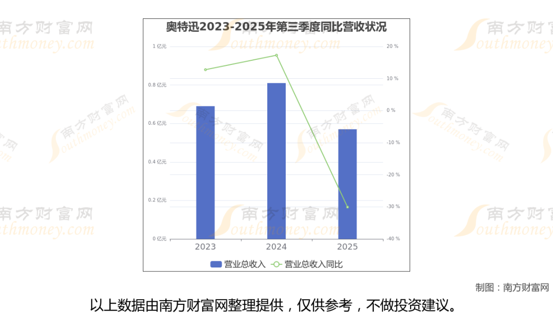 奥特迅2025年第三季度报告显示(如上图),公司实现主营业务收入5683.2万元,较去年同期增长-30.07%。