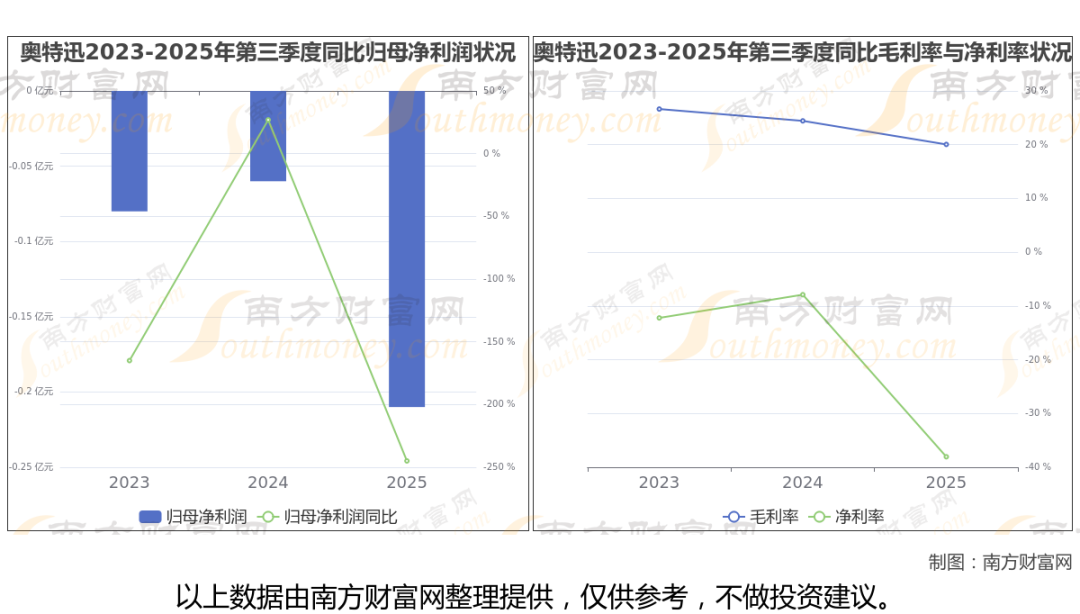 2025年第三季度季报显示,奥特迅公司毛利率20.05%,净利率-38.05%,归属净利润-2055.96万,同比增长-244.95%。