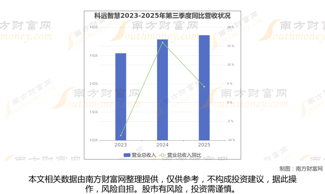 在2025年第三季度,科远智慧的业绩表现(如上图),主营业务收入达到3.72亿元,实现了4.22%的同比增长率。