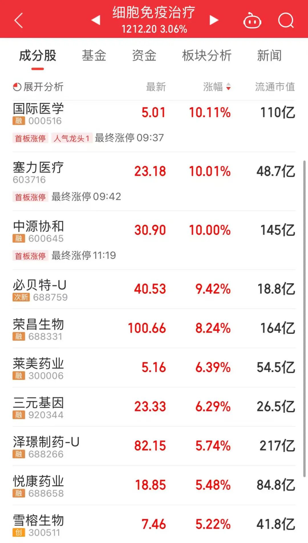 今天上午,医药股全线反弹。细胞免疫治疗、医疗服务、生物制品、创新药等板块走强,恒瑞医药、迈瑞医疗、百济神州等龙头股上涨。