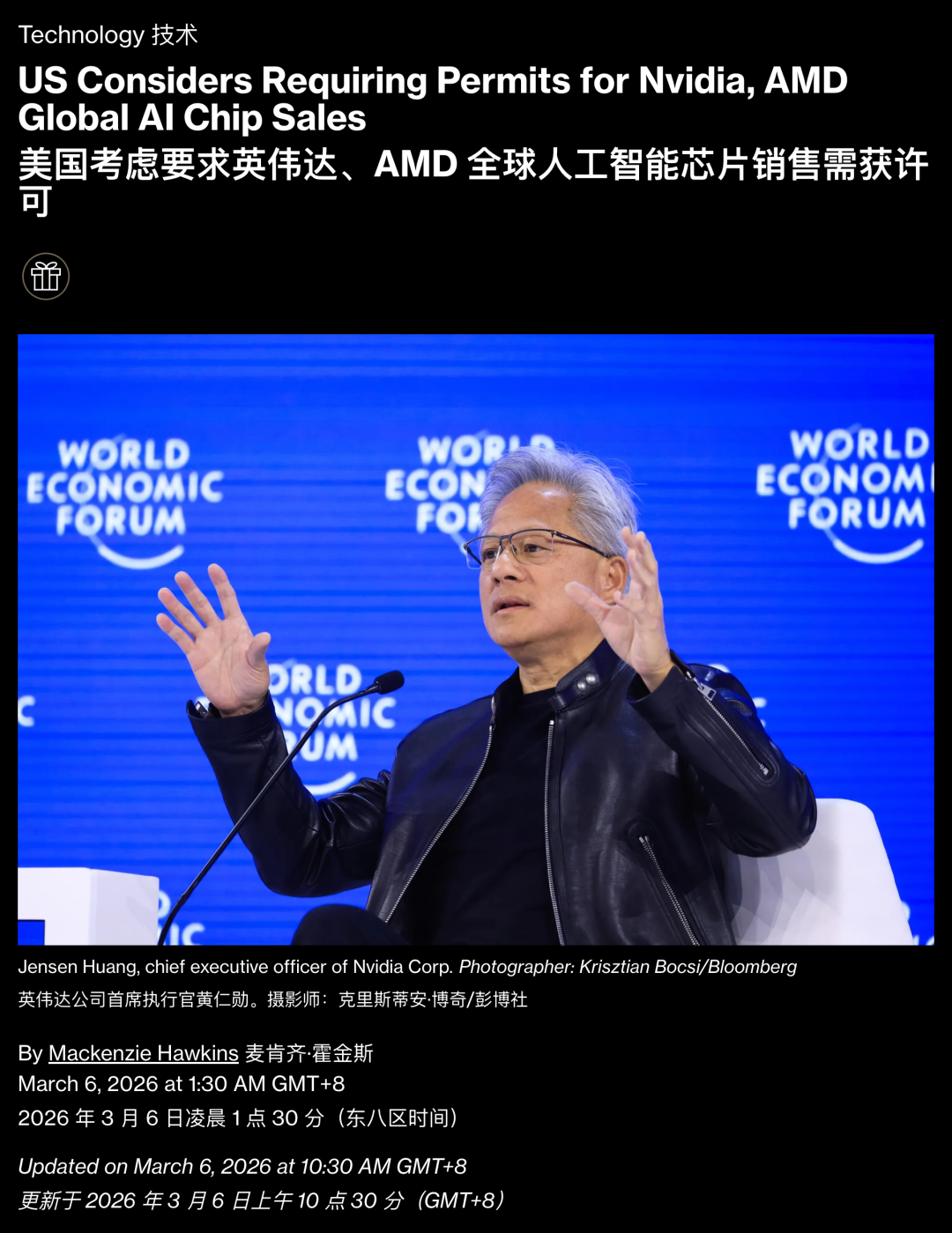 彭博社今天最新披露的内部政策草案显示,美国商务部正酝酿一项极端措施,计划对英伟达与 AMD 等企业的先进 AI 芯片实施全球范围的出口许可制度。