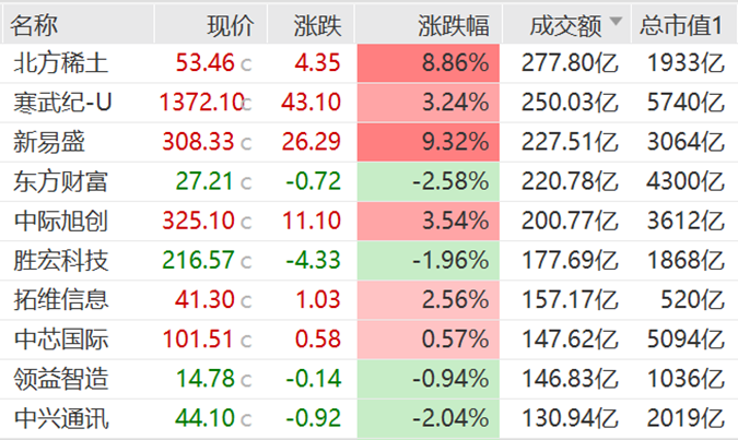 成交额前100的个股中,跌幅超过5%的极少;同时,成交额100亿级的个股中,仅少数出现明显下跌;