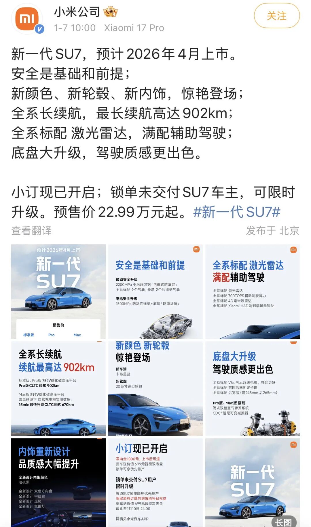 1月7日,小米汽车正式宣布,旗下首款量产车型SU7迎来首次改款,新一代SU7即日起开启小订,预计将于同年4月正式上市。