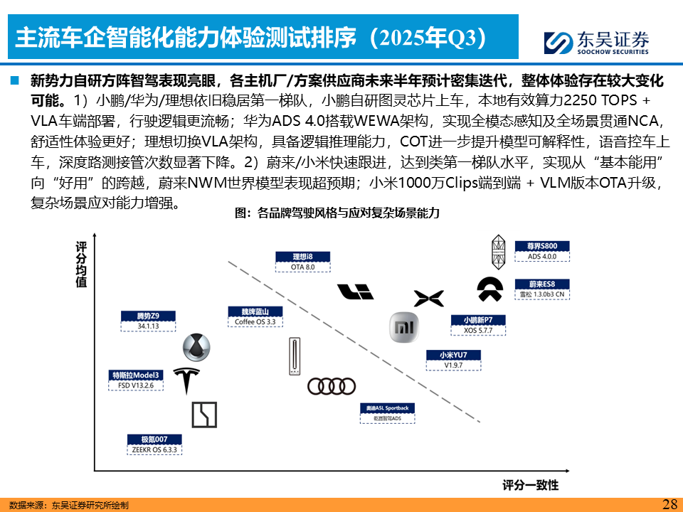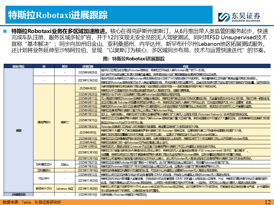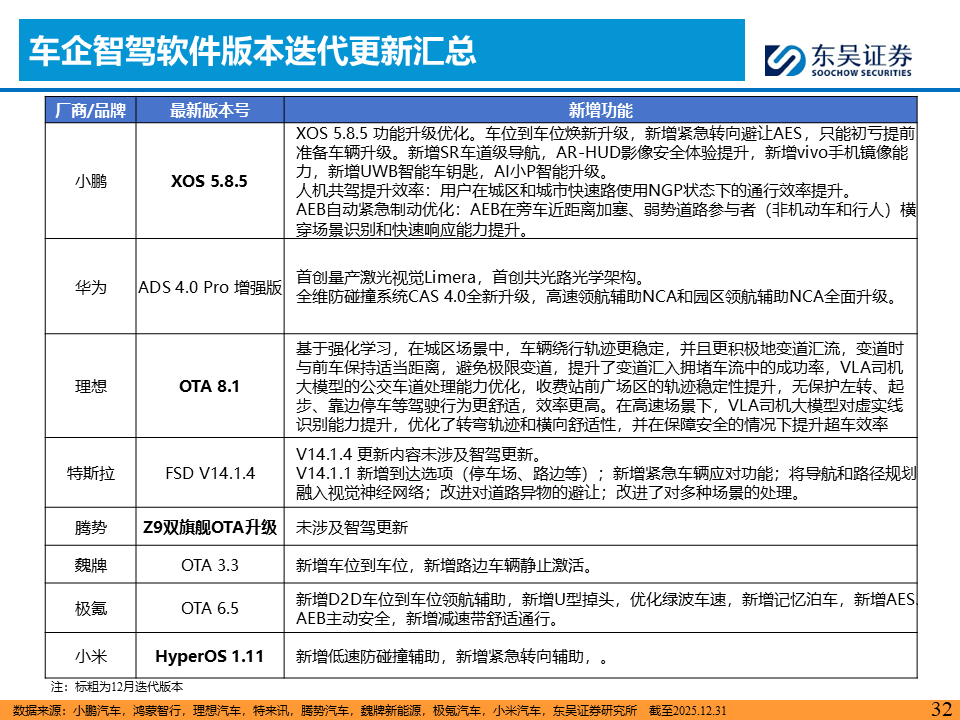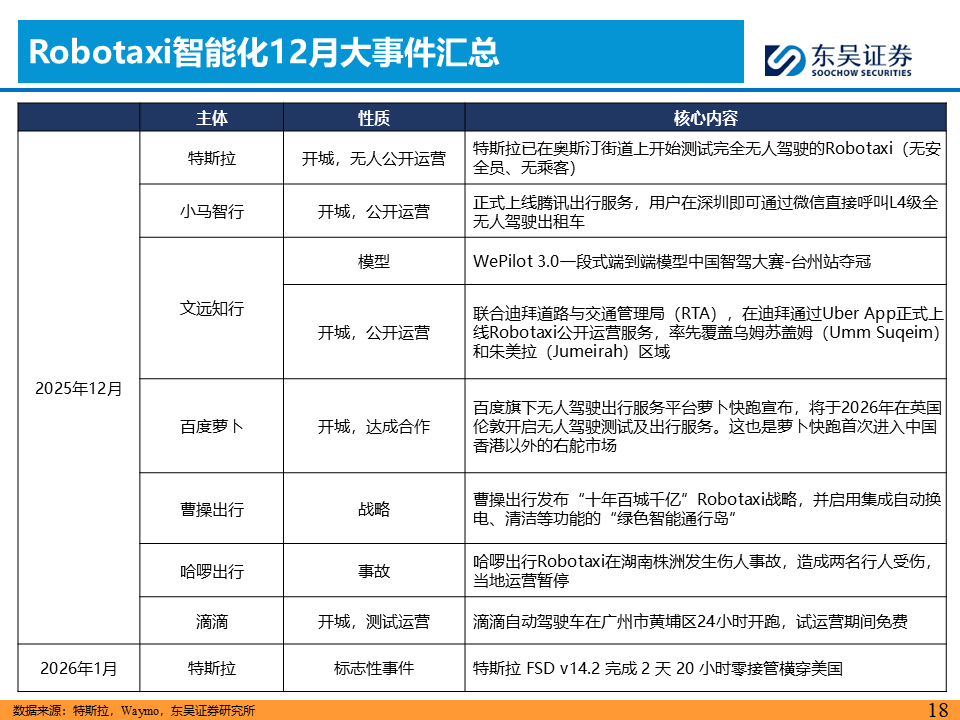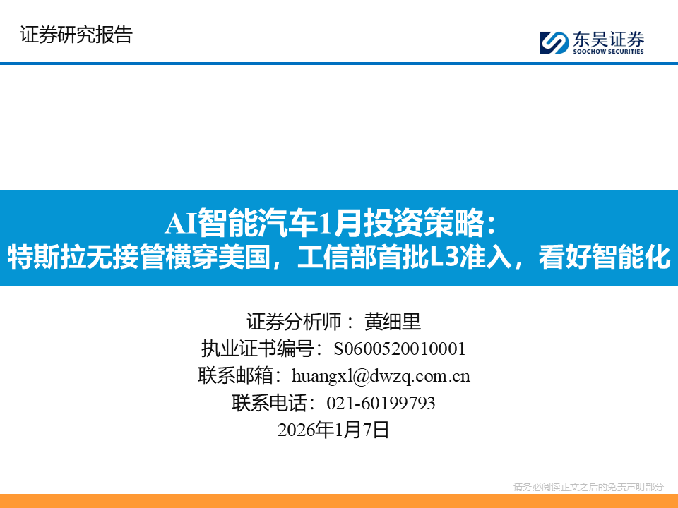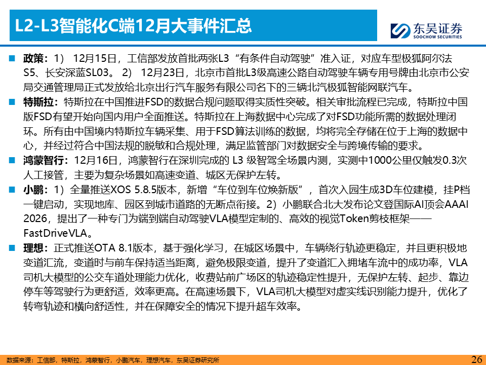 或步入Robotaxi爆发大年,技术与政策双轮驱动AI智能汽车“iPhone时刻”加速到来。CES 2026或成为产业风向标,英伟达CEO黄仁勋的演讲预计将聚焦物理AI最新进展,关注新石器、长城等L4/L3进展。L4维度,关注特斯拉FSD V14.2版本横穿美国零接管表现及其车队规模扩充进度。L3维度,继2025年12月15日工信部发放首批L3级自动驾驶准入许可,2026年1月将是车型在重庆、北京等地开启公开道路商业化试点的首个完整月份,关注运营接管率、事故责任认定的实际案例。