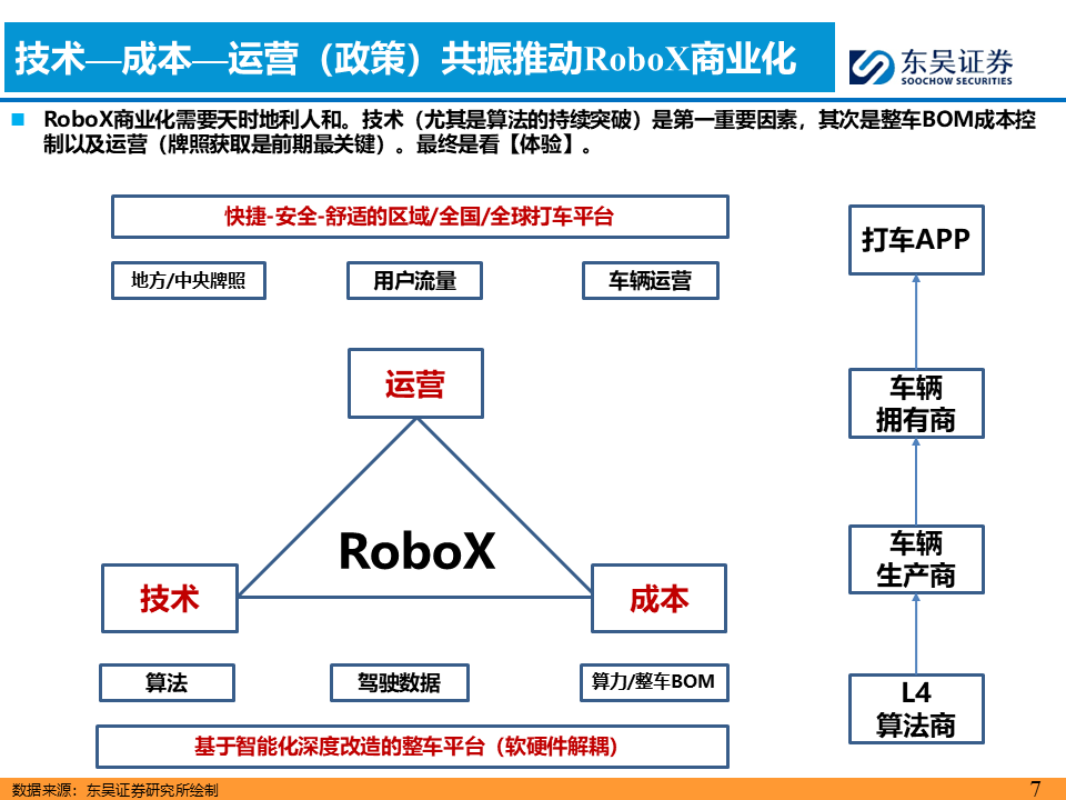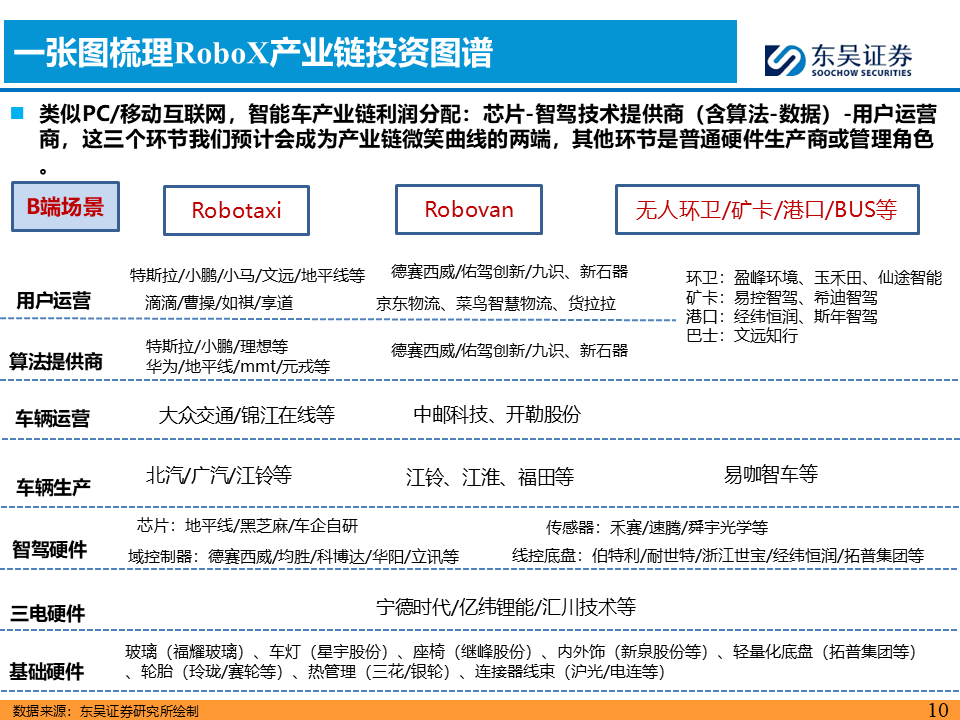 1)B端无人车代工(北汽蓝谷/广汽集团/江铃汽车/同力股份/易咖智驾(拟上市));2)核心上游供应商:检测服务(中国汽研/中汽股份等)/芯片(地平线机器人 黑芝麻智能)/域控制器(德赛西威/经纬恒润/均胜电子/华阳集团/科博达等)/传感器(舜宇光学科技/禾赛/速腾聚创)/线控底盘(伯特利/耐世特/浙江世宝)/车灯(星宇股份)/玻璃(福耀玻璃)等