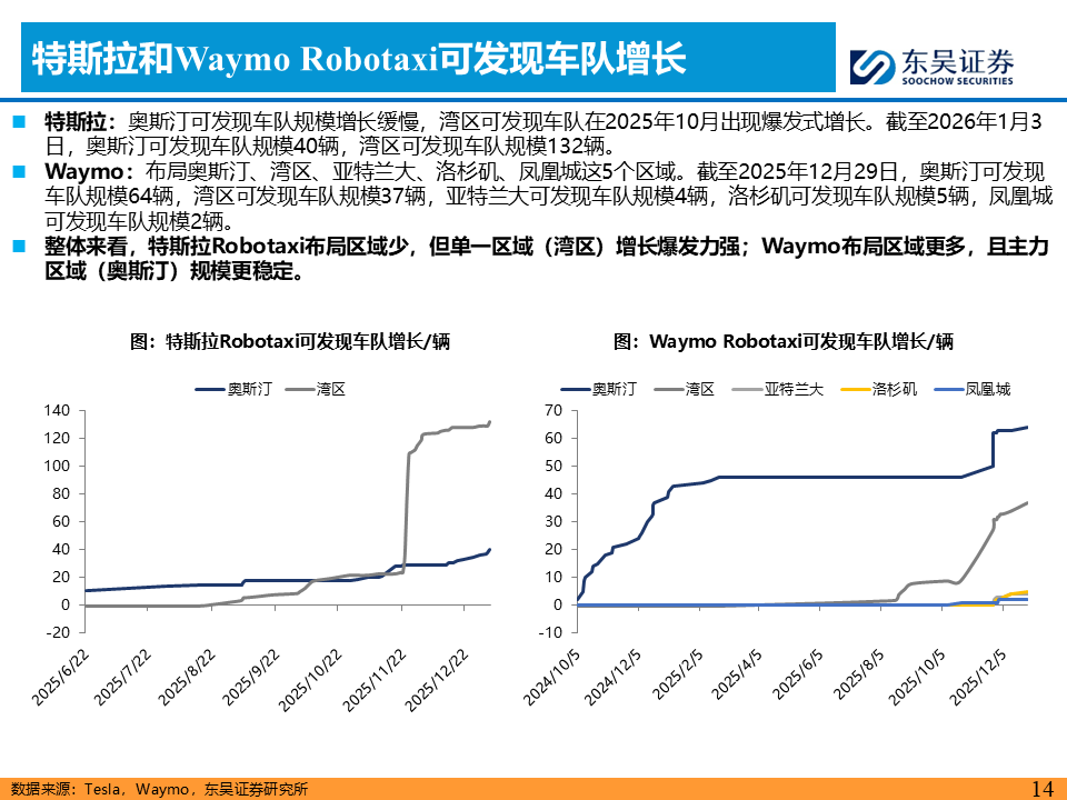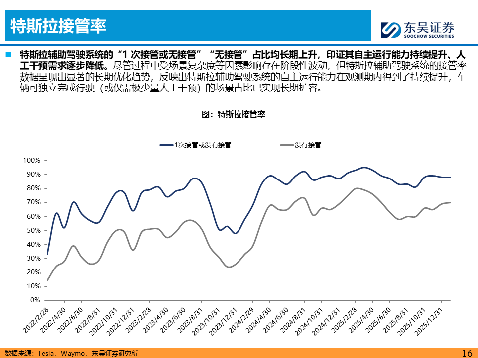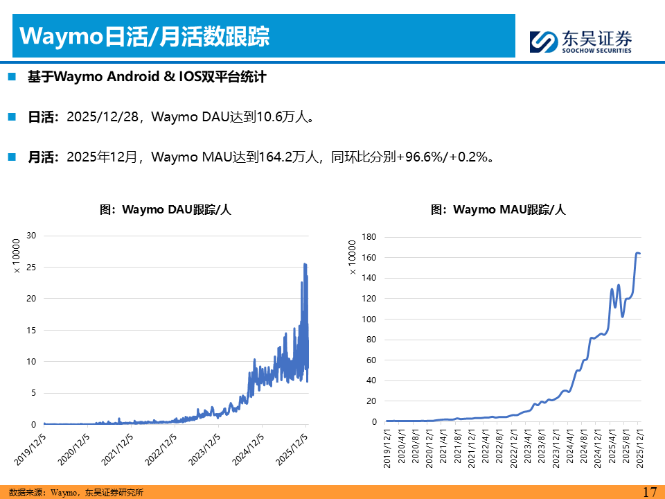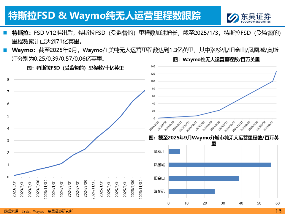 L4商业化全球共振,L3政策“0-1”破冰。L4运营端呈现中美双强格局,特斯拉在奥斯汀开启无安全员/无乘客的纯无人测试,且中国版FSD数据闭环在上海完成合规建设 ;Waymo月活用户同比增长96.6%至164万人,商业模型验证加速;国内小马智行接入微信生态、文远知行落地迪拜,曹操“十年百城千亿”Robotaxi战略,商业化版图持续扩张。L3政策端迎来里程碑式突破,工信部发放首批L3准入许可(极狐/深蓝),北京发放L3路测牌照,标志着国内自动驾驶从辅助驾驶向有条件自动驾驶正式跨越 。