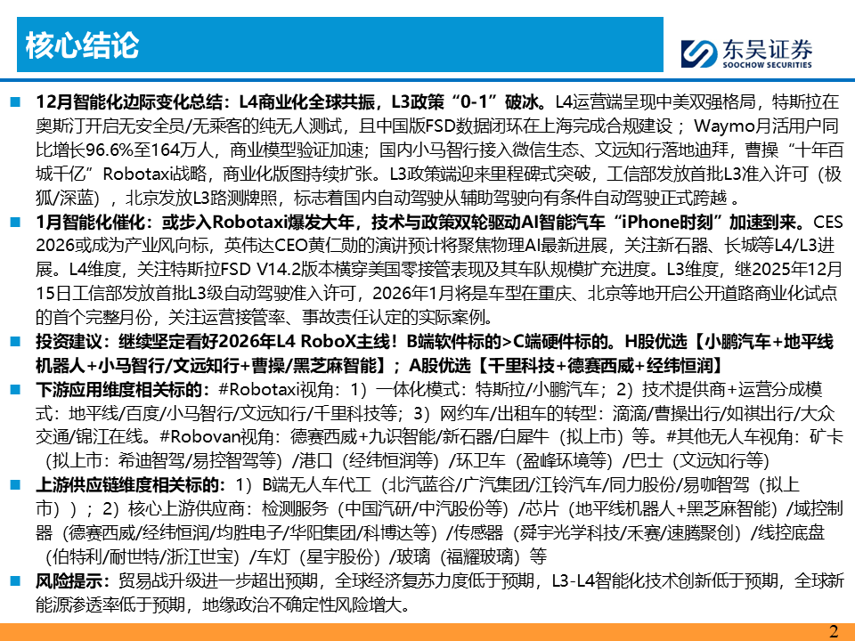 继续坚定看好2026年L4 RoboX主线!B端软件标的>C端硬件标的。H股优选【小鹏汽车 地平线机器人 小马智行/文远知行 曹操/黑芝麻智能】;A股优选【千里科技 德赛西威 经纬恒润】