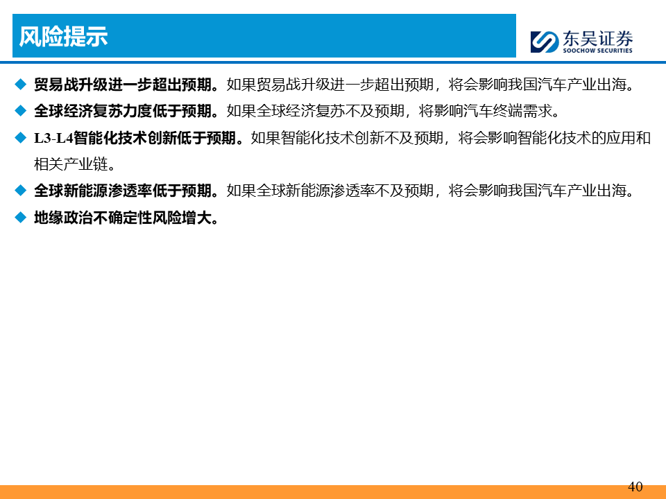 贸易战升级进一步超出预期,全球经济复苏力度低于预期,L3-L4智能化技术创新低于预期,全球新能源渗透率低于预期,地缘政治不确定性风险增大。