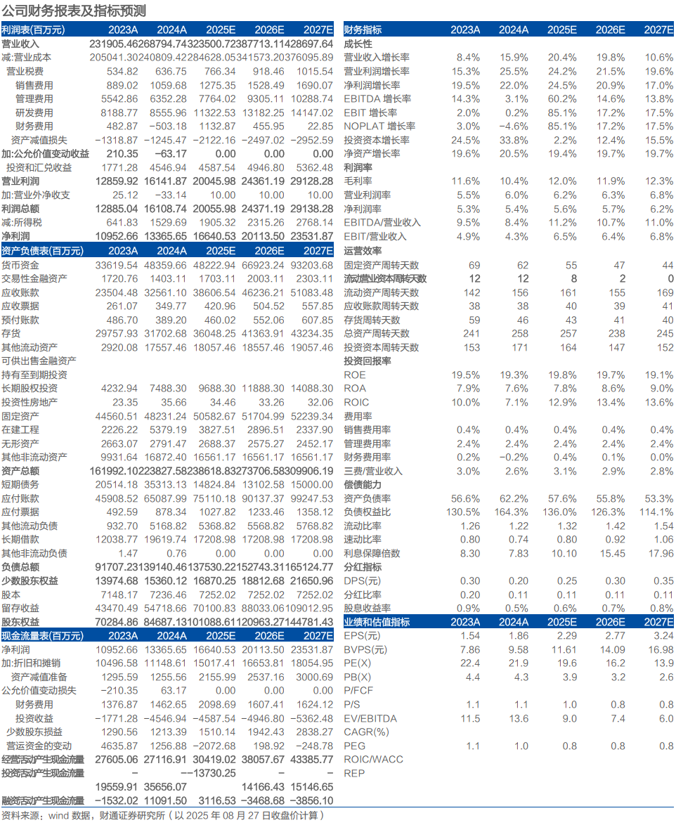 投资建议:公司业绩稳健指引延续增长,消费电子/通信/汽车齐发力。我们预计公司2025-2027年归母净利润为166.41/201.13/235.32亿元,EPS为2.29/2.77/3.24元,对应PE为19.60/16.22/13.86倍,维持“增持”评级。