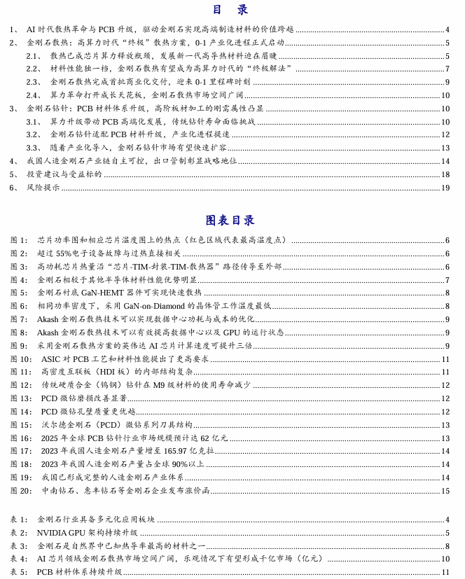 我们认为,人造金刚石行业的投资主线正在由传统景气驱动切换至AI算力驱动。金刚石散热与金刚石(PCD)钻针分别受益于算力系统散热革命以及高阶PCB制造升级,构成行业双轮驱动的核心增长引擎。金刚石散热作为高算力时代的“终极”散热方案,具有划时代意义和产业化潜力,0-1产业化进程正式启动,未来有望成为千亿级蓝海市场;金刚石(PCD)钻针PCB材料体系升级,高阶板材加工的刚需属性凸显,渗透率提升市场有望快速扩容。
