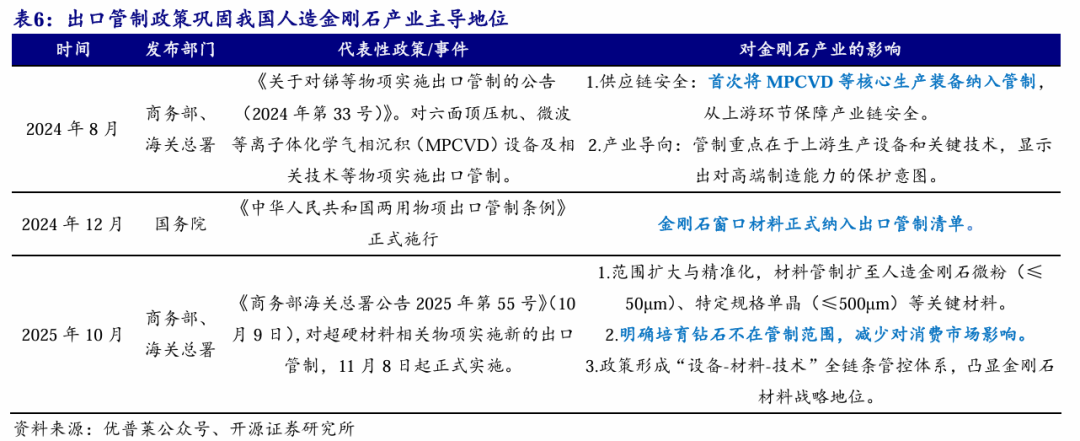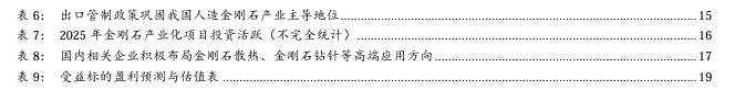 出口管制政策彰显人造金刚石战略地位,推动我国人造金刚石行业从规模优势向技术壁垒突围。金刚石是被誉为“工业牙齿”的超硬材料,广泛应用于芯片切割、航空航天、军工装备等战略领域,其战略地位堪比稀土。我国金刚石出口管制政策呈现出从设备到材料、从宏观到微观的精准化路径。2024年针对六面顶压机和MPCVD设备等生产工具,而2025年规则细化至特定粒径的金刚石微粉(≤50μm)和单晶(≤500μm),甚至对线锯的线径(≤45μm)、砂轮的硬度(≤30HRB)等参数设定精确门槛。出口管制政策的落地,短期可能增加企业出口合规成本,部分依赖海外低端市场的中小企业将面临更大的经营压力,但长期来看出口管制政策将倒逼低端产能出清,助推龙头企业布局高附加值的应用环节,进一步巩固金刚石产业链在全球的主导地位,推动产业高端化、自主化发展,为国家战略安全和科技自立自强提供坚实支撑。