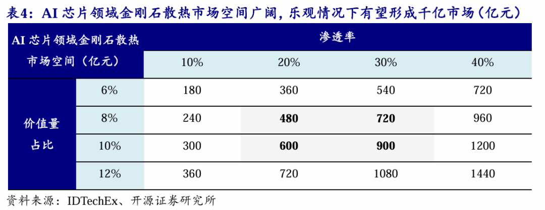 AI算力革命打开成长天花板,金刚石散热市场空间广阔。我们假设2030年全球AI芯片市场规模3万亿人民币,假设金刚石散热在AI芯片环节价值量占比分别为6%-12%,假设金刚石散热方案在AI芯片中渗透率10%-40%,对2030年金刚石散热市场规模进行敏感性测算。中性情景下,2030年AI芯片领域金刚石散热市场规模有望达480-900亿元。