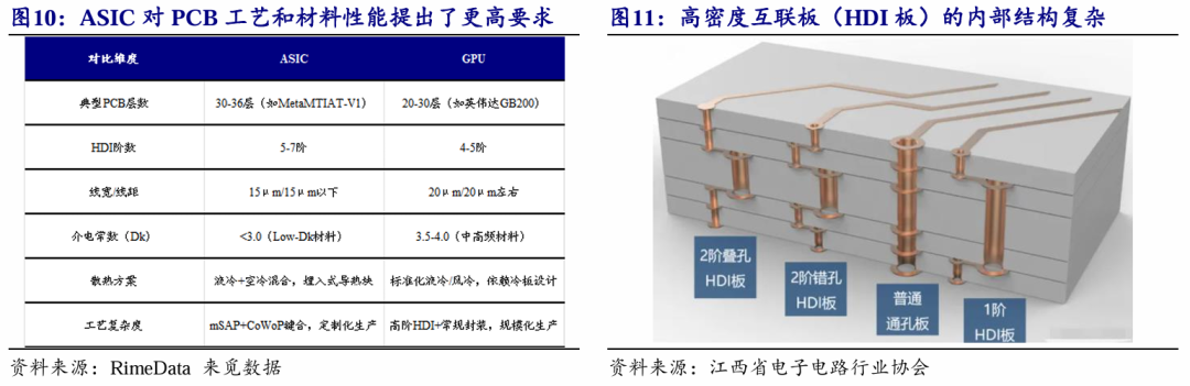 AI的快速发展对底层PCB基材的信号传输、散热、尺寸稳定性提出了颠覆性要求,驱动PCB行业高速发展。AI大模型的横空出世使得算力需求激增,倒逼PCB在层数设计、材料选型及工艺精度等方面全面升级。以AI服务器为例,GPU板组扩容推动连接带宽需求激增,促使PCB层数从常规8-12层向16 层演进,并需采用M9系列等低损耗覆铜板确保信号完整性。此外,CPO(共封装光学)技术的渗透进一步催生对HDI板及刚挠结合板的需求,持续拓展高端应用场景。ASIC芯片凭借其高度定制化特性及优异的能效表现,正成为AI训练与推理场景中的核心硬件,其先进封装技术对高频高速PCB提出了更严苛的性能指标。